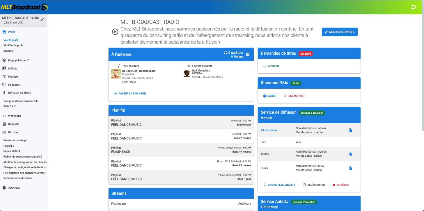 Nous sommes fiers de vous présenter notre service d'hébergement radio, conçu spécialement pour les passionnés de webradio, les créateurs de contenu audio et les entreprises qui aspirent à diffuser leur message à travers le monde. Chez MLT BROADCAST, nous mettons à votre disposition une suite complète de fonctionnalités puissantes, basées sur la technologie éprouvée d'AzuraCast, pour vous aider à créer, gérer et promouvoir votre station de radio en ligne.